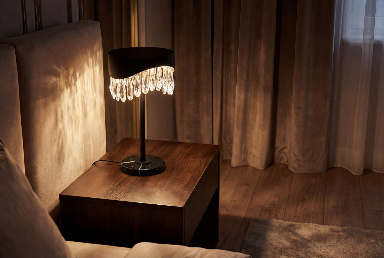 Svietidlo je vyrobené z odolného nerezového kovu s prémiovou úpravou povrchu, pričom jeho dizajn dopĺňajú precízne brúsené kryštály podporujúce odraz a lom svetla. Technológia spracovania zabezpečuje stabilitu materiálu a jeho dlhodobú estetiku.