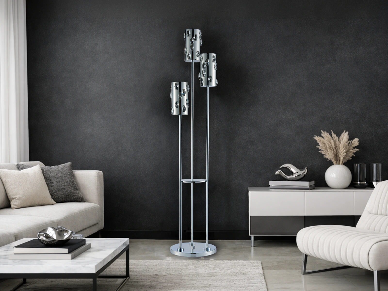 LED stojace svietidlo značky VIZARDI zo série CLARIS zaujme elegantným tvarom a luxusnými kryštálovými detailmi, ktoré vytvárajú pôsobivé svetelné efekty. Vďaka modernému a nadčasovému dizajnu je ideálne ako doplnkové osvetlenie do obývačky, pracovne, chodby alebo spálne.