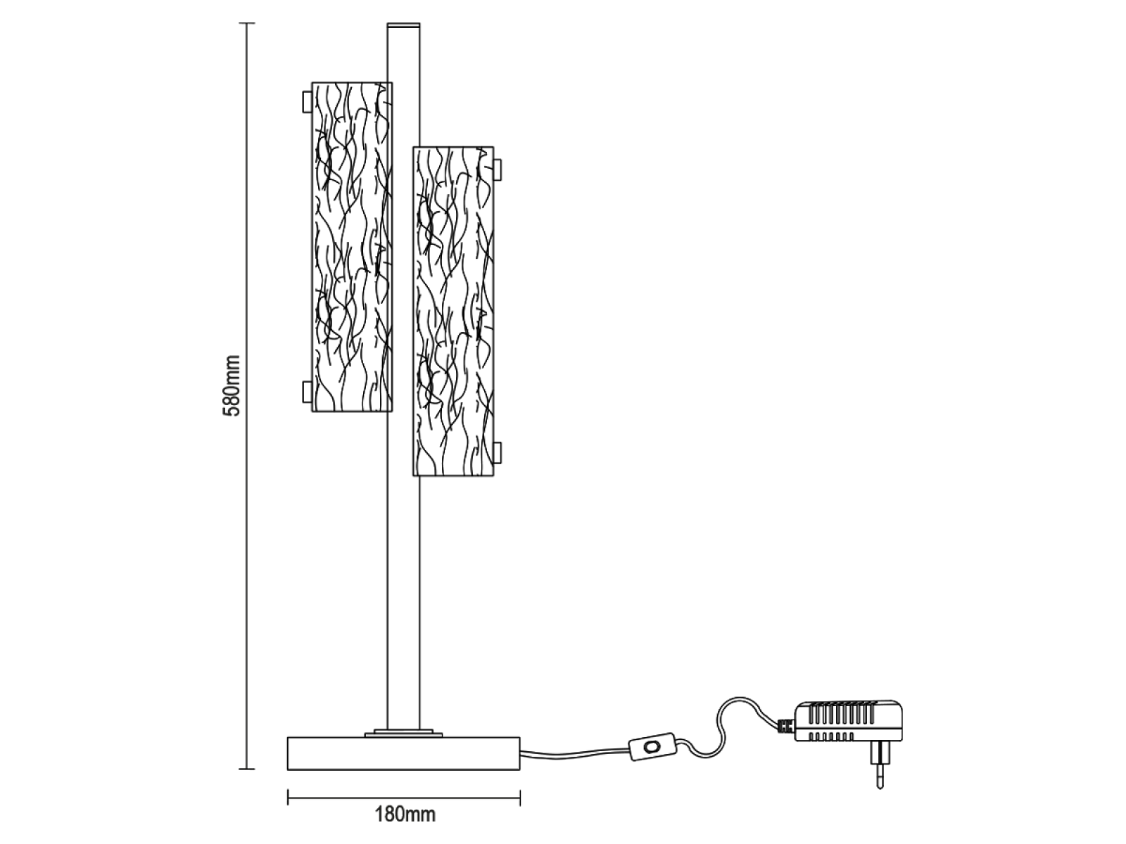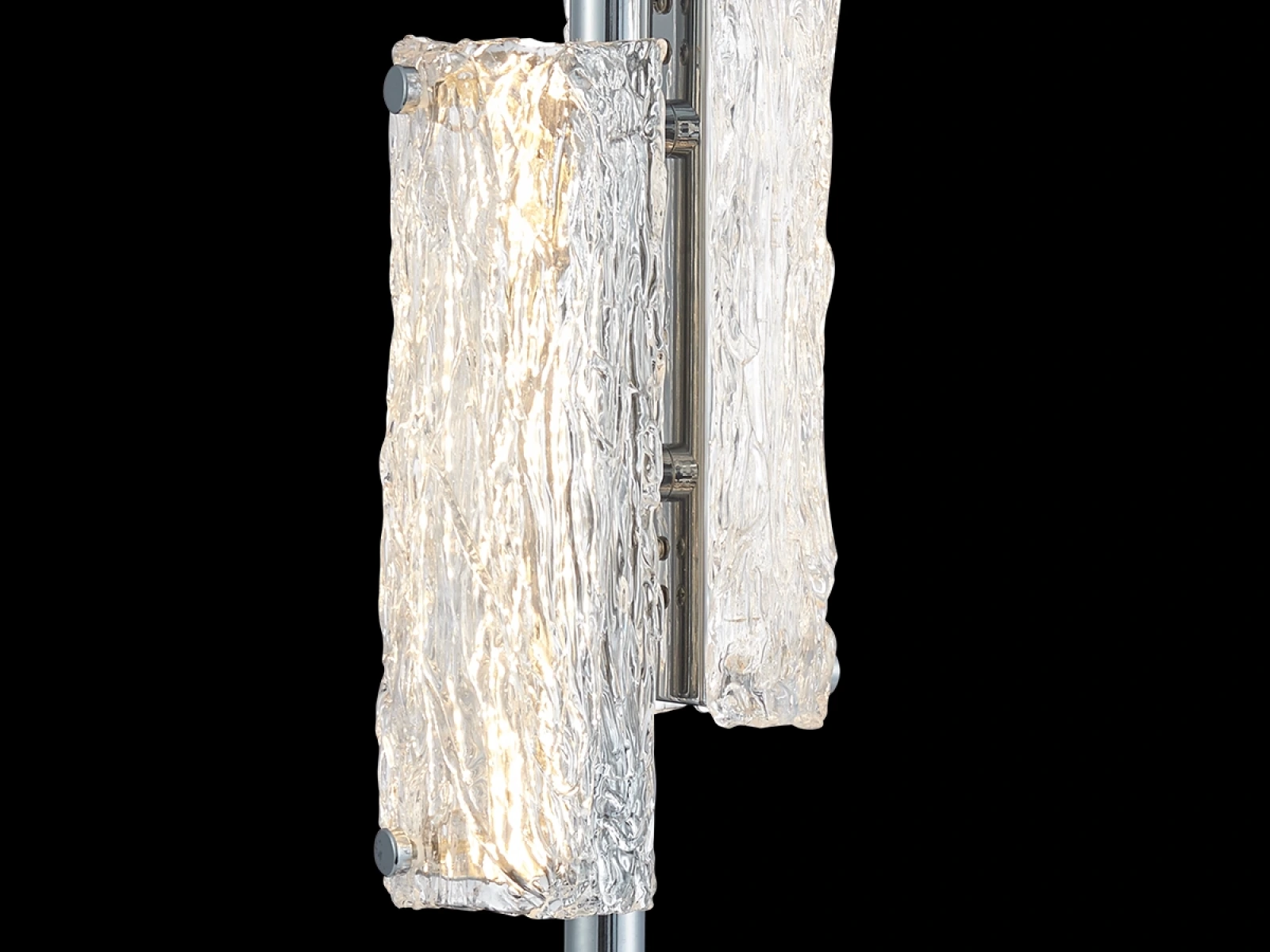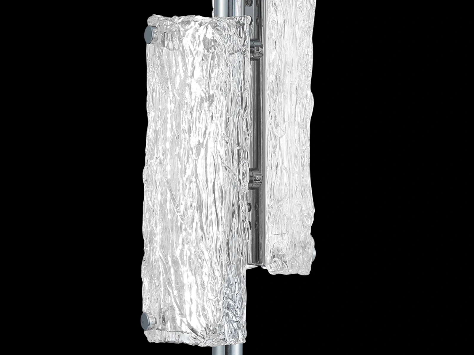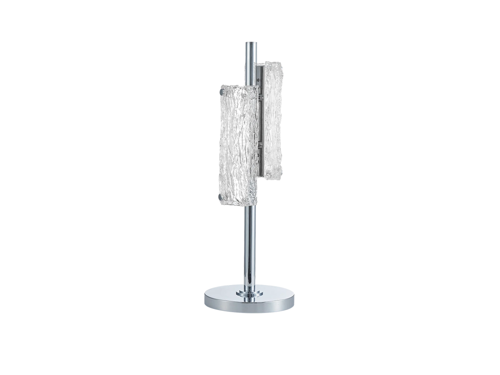 Svietidlo je vyrobené z vysokokvalitného nerezového kovu s chrómovou povrchovou úpravou, ktorá zabezpečuje dlhodobú odolnosť, stabilitu a luxusný vzhľad. Sklenené prvky so štruktúrovaným povrchom inšpirovaným kôrou zabezpečujú rovnomerný a príjemný rozptyl svetla.