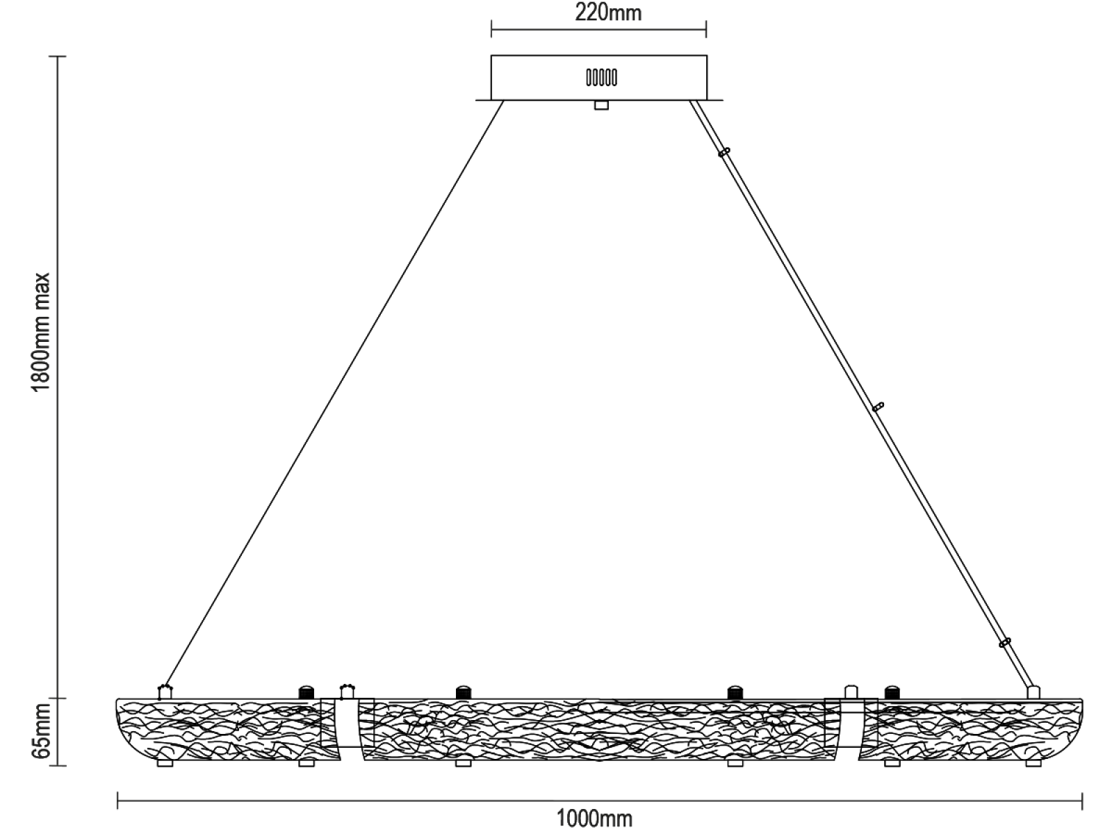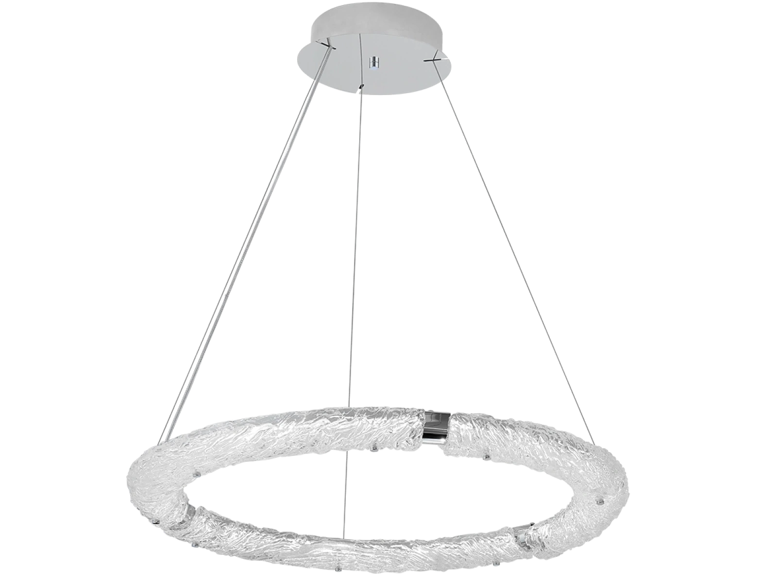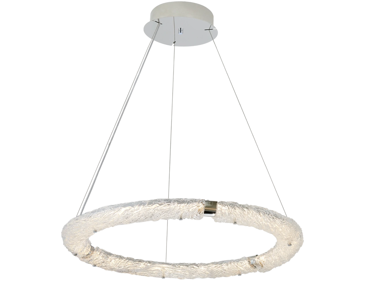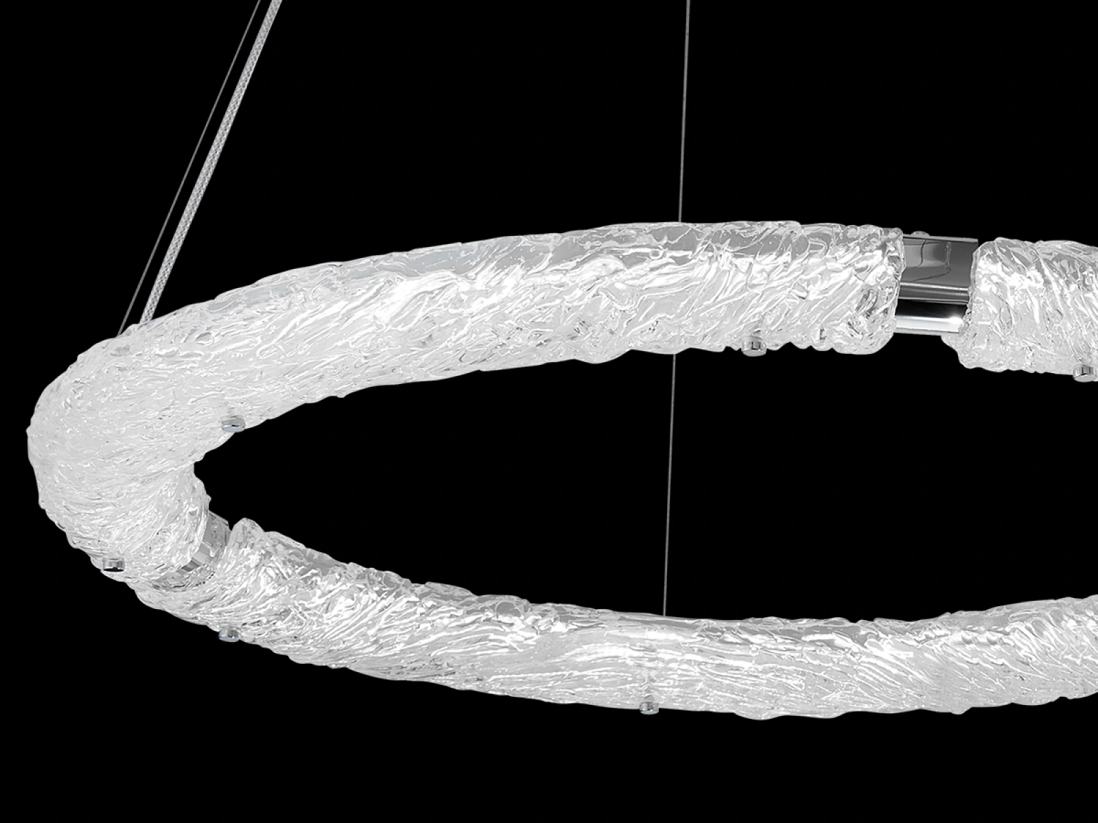 Svietidlo je vyrobené z vysokokvalitného nerezového kovu s chrómovou povrchovou úpravou, ktorá zabezpečuje dlhodobú odolnosť, stabilitu a luxusný vzhľad. Sklenené prvky so štruktúrovaným povrchom inšpirovaným kôrou zabezpečujú rovnomerný a príjemný rozptyl svetla.