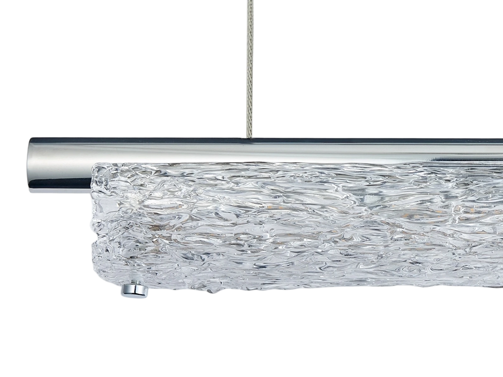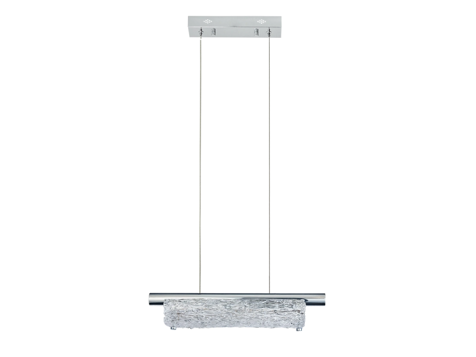 Svietidlo je vyrobené z vysokokvalitného nerezového kovu s chrómovou povrchovou úpravou, ktorá zabezpečuje dlhodobú odolnosť, stabilitu a luxusný vzhľad. Sklenené prvky so štruktúrovaným povrchom inšpirovaným kôrou zabezpečujú rovnomerný a príjemný rozptyl svetla.