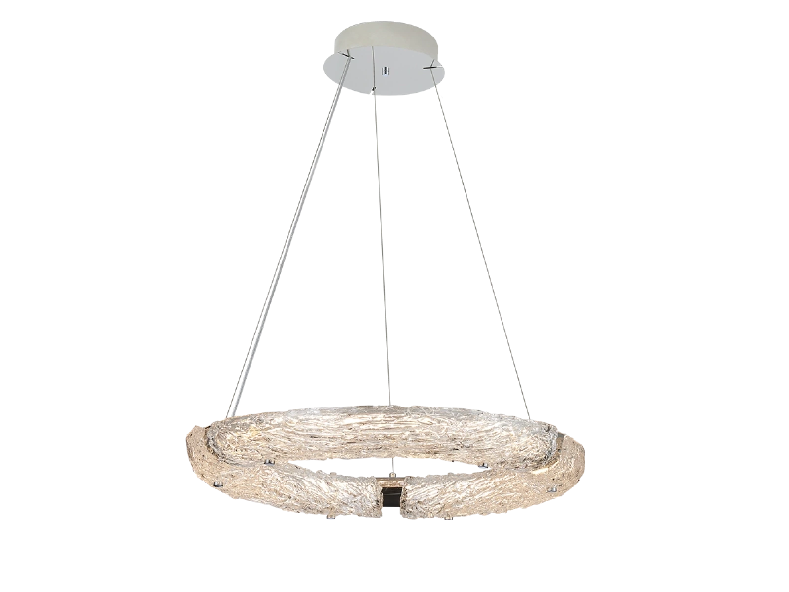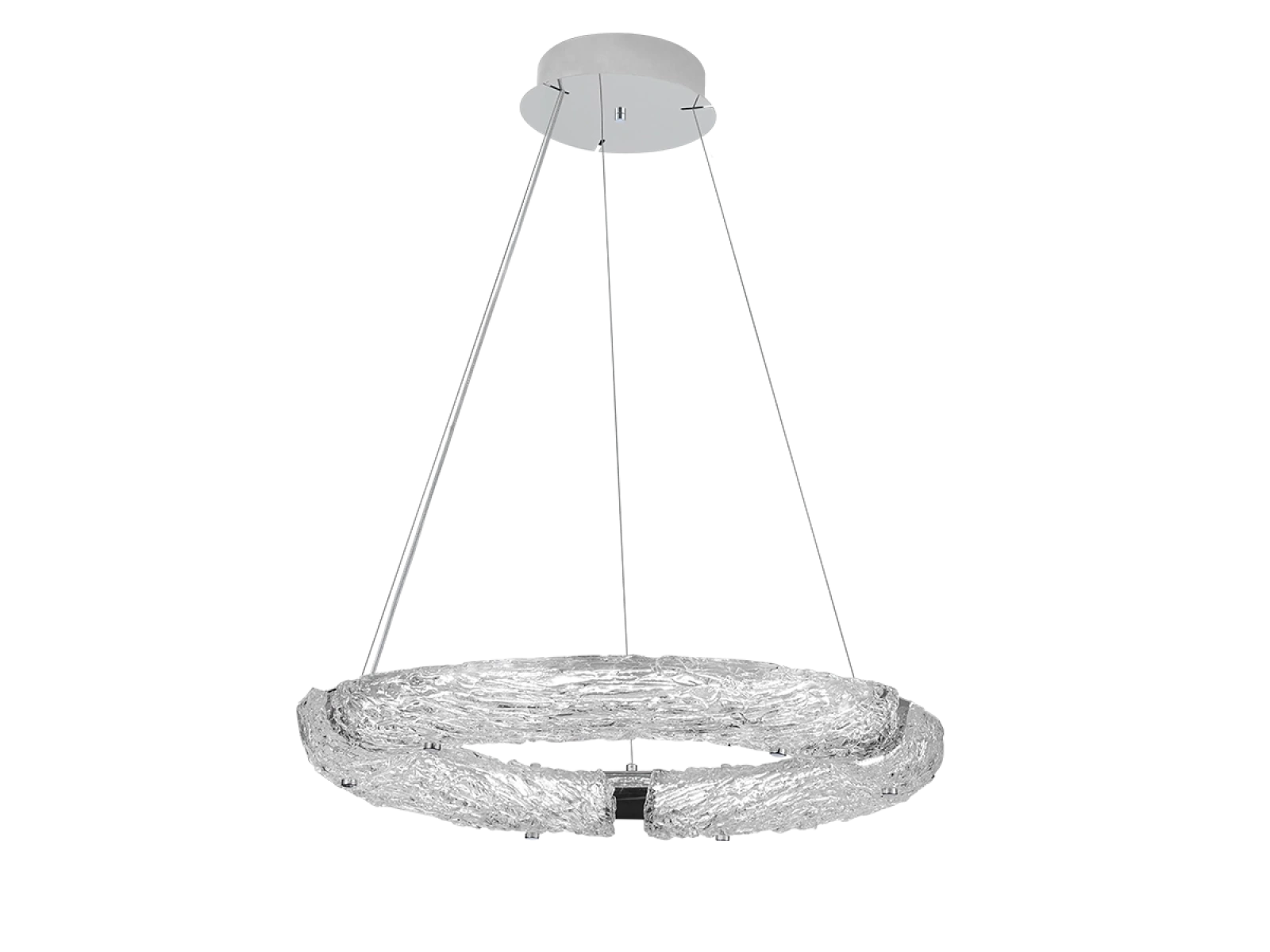 Svietidlo je vyrobené z vysokokvalitného nerezového kovu s chrómovou povrchovou úpravou, ktorá zabezpečuje dlhodobú odolnosť, stabilitu a luxusný vzhľad. Sklenené prvky so štruktúrovaným povrchom inšpirovaným kôrou zabezpečujú rovnomerný a príjemný rozptyl svetla.