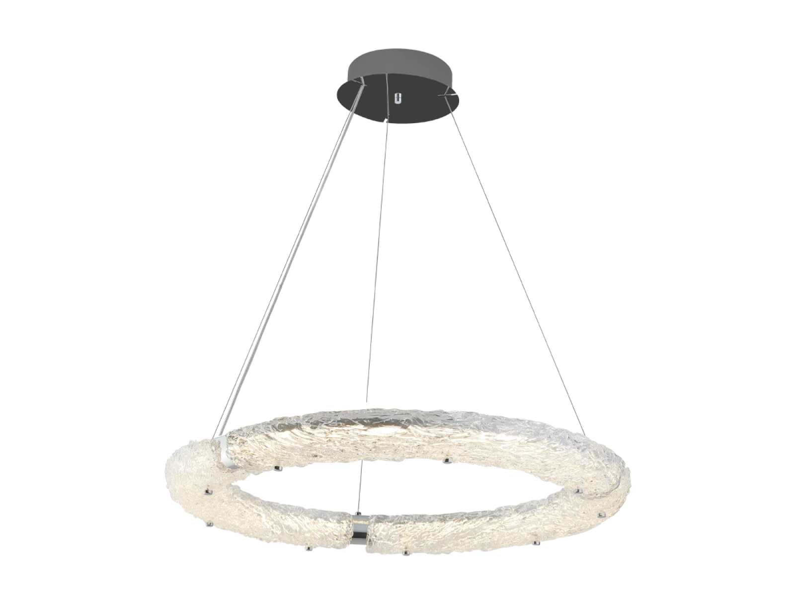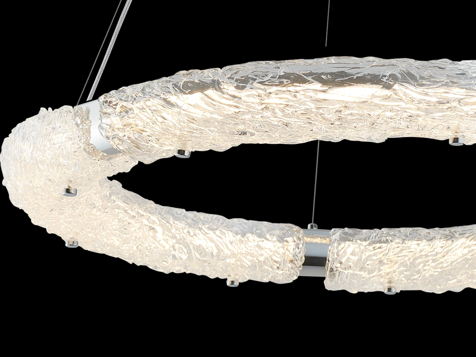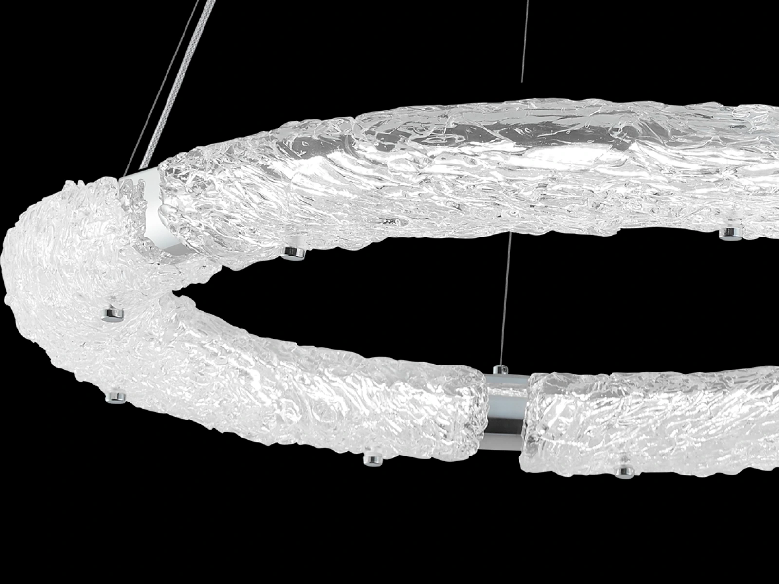 Svietidlo je vyrobené z vysokokvalitného nerezového kovu s chrómovou povrchovou úpravou, ktorá zabezpečuje dlhodobú odolnosť, stabilitu a luxusný vzhľad. Sklenené prvky so štruktúrovaným povrchom inšpirovaným kôrou zabezpečujú rovnomerný a príjemný rozptyl svetla.
